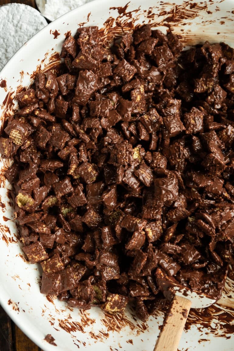 My siblings and I grew up saying “pet chow,” however now I largely name it “mud chow.” My mother would make a giant batch, toss the powdered sugar in a Ziploc bag, add chocolate cereal, and we’d take turns shaking the snack to coat it within the powdery goodness. We are able to’t wait to search out out!